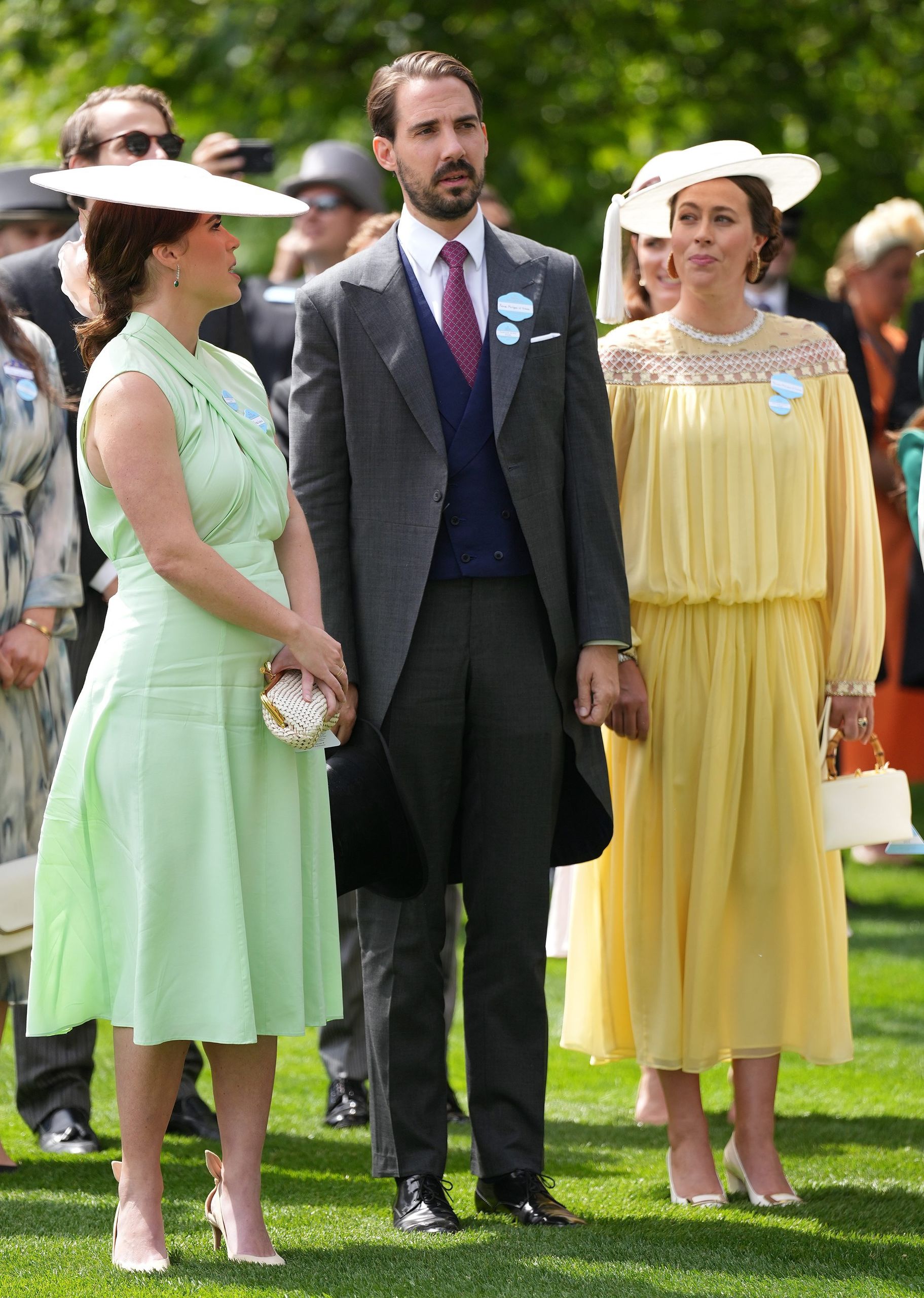 La princesa Beatriz de York, con un vestido verde menta de escote cruzado de Diane von Furstenberg y sombrero de Emily London, ha estado con el príncipe Philippos de Grecia y su mujer, Nina Flohr con un vestido amarillo de seda con bordados en el escote y en los puños de Adam Lippes, combinado con zapatos blancos de Roger Vivier, bolso de Jill Sander y sombrero blanco de Emily London.