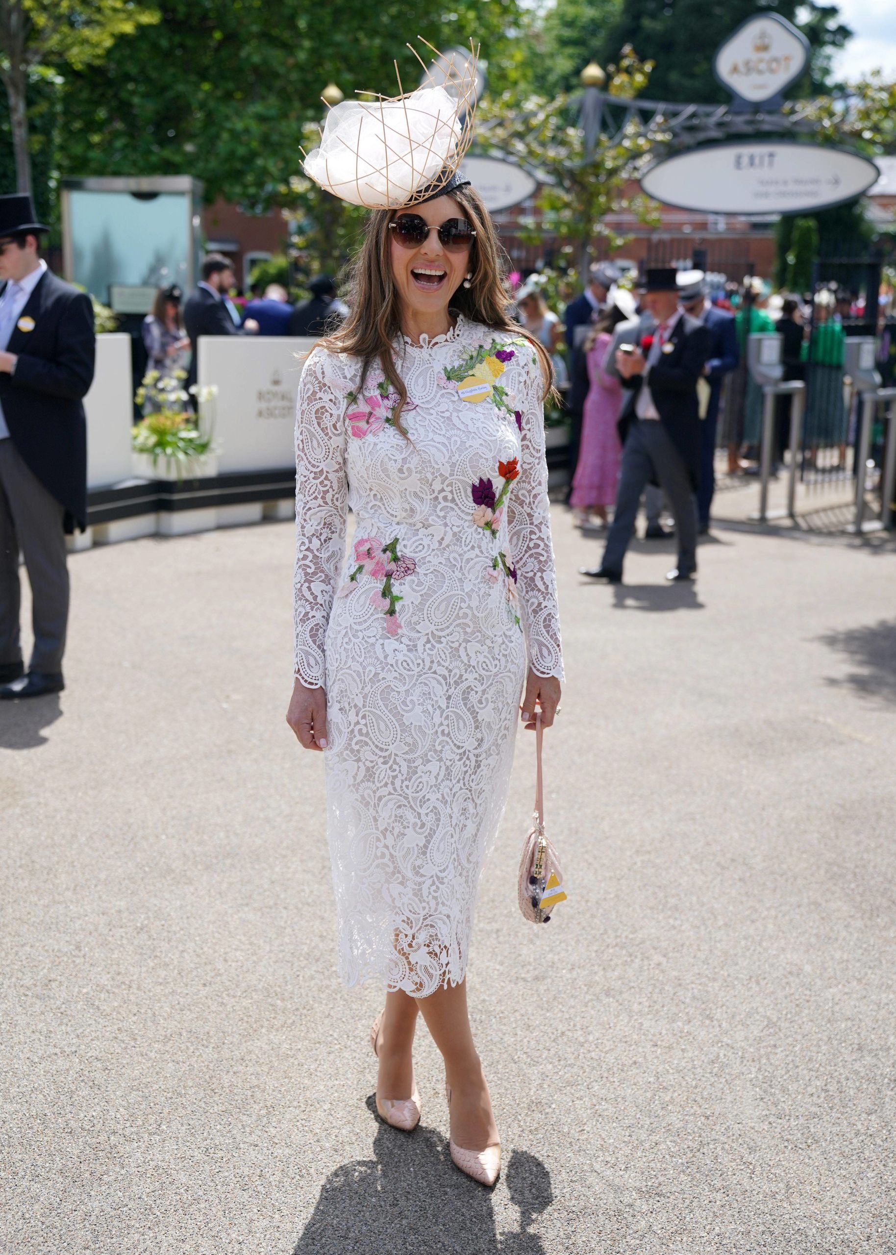 La actriz Elizabeth Hurley con vestido blanco de encaje con flores de colores bordadas de Monique Lhuillier y tocado del prestigioso sombrerero inglés Stephen Jones, que recordaba a un frutero de mimbre desmenuzado con tela de tul, a falta de frutas.