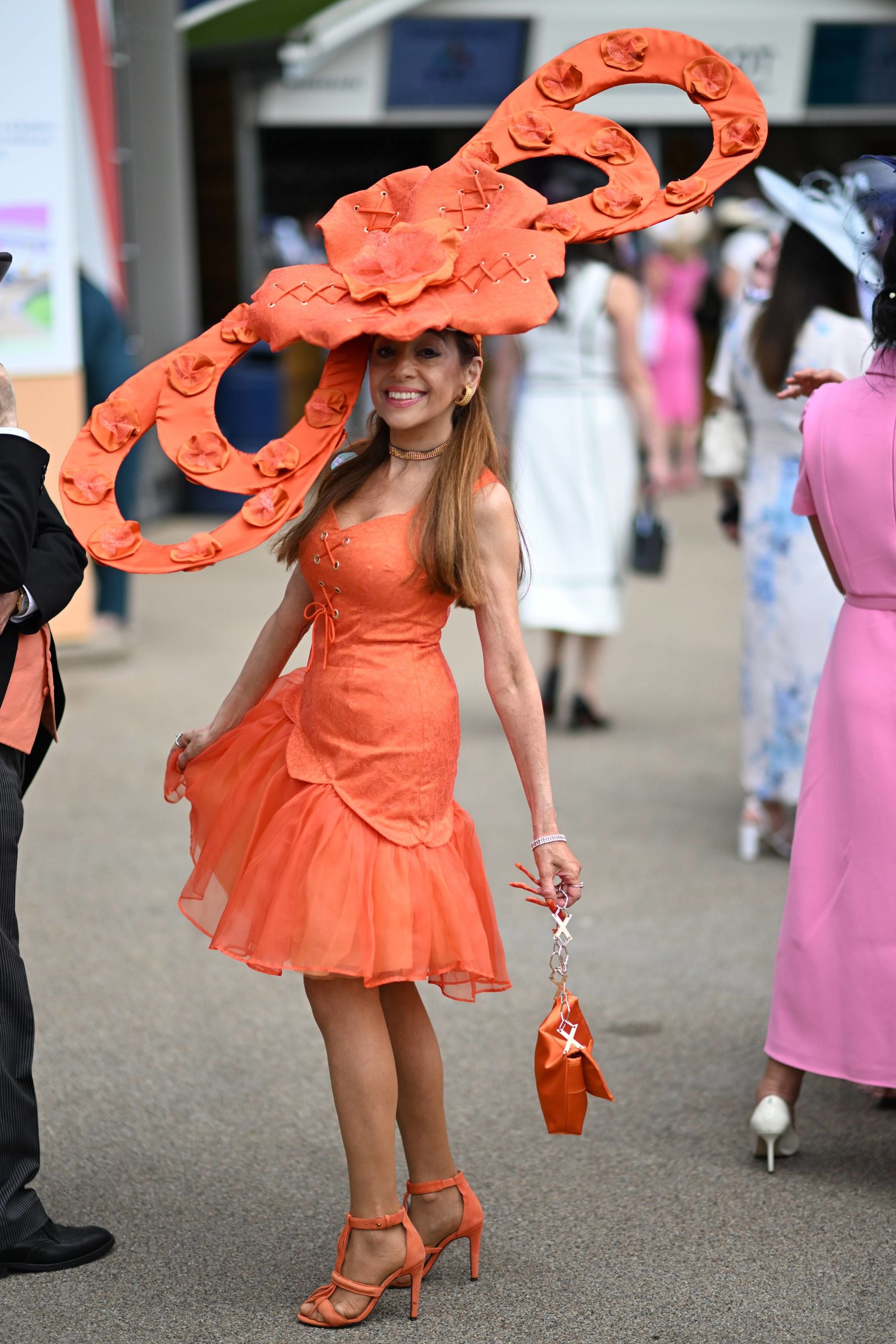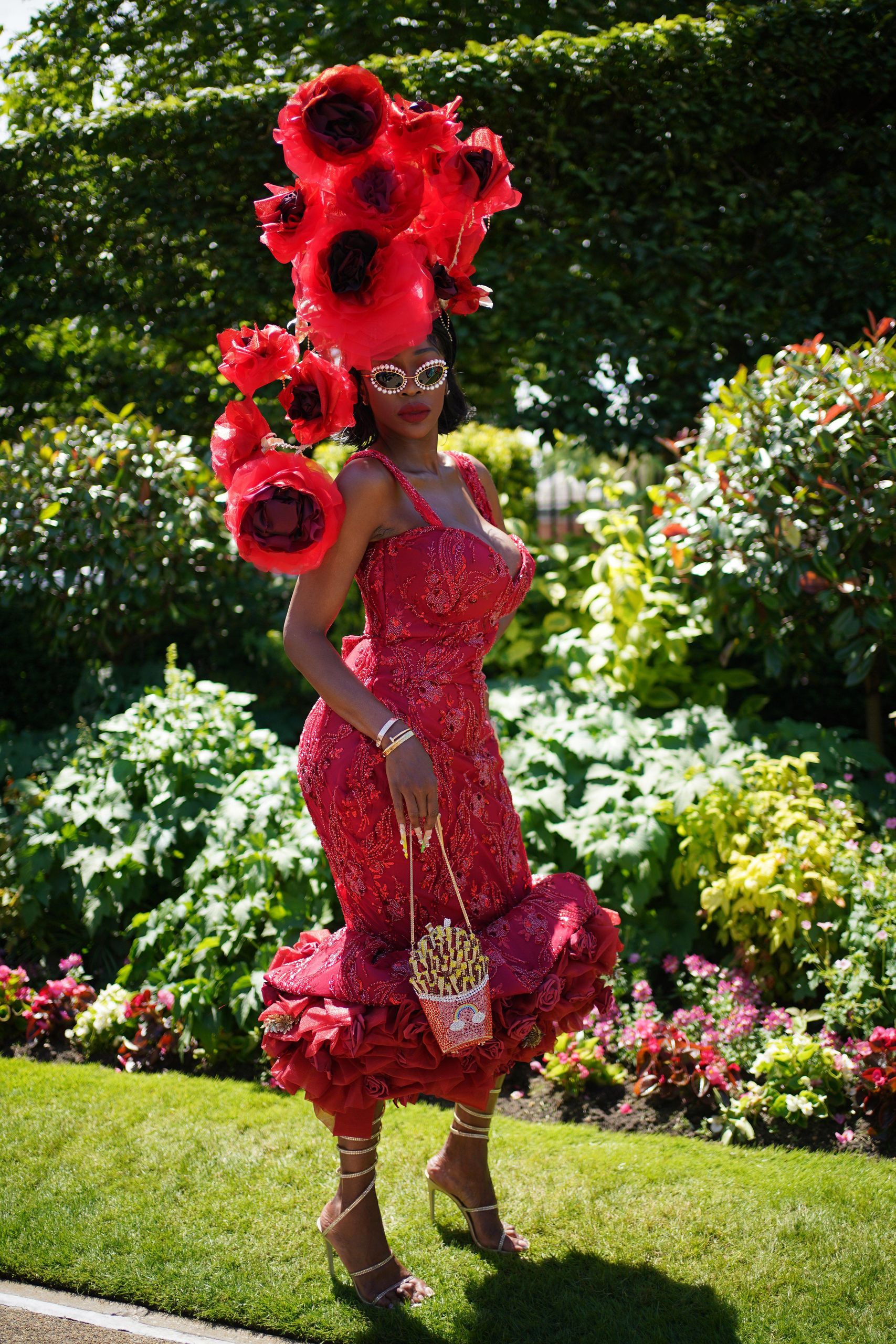 Royal Ascot es una competición con más de tres siglos de historia, se caracteriza por los impactantes 'looks' que coronan las cabezas de sus asistentes en fomra de pamela o tocado. Lystra Adams, protagonista del reality inglés Real Housewives of Cheshire ha lucido este singular y discreto “campo de amapolas" y bolso imitación de patatas fritas de Debimy.
