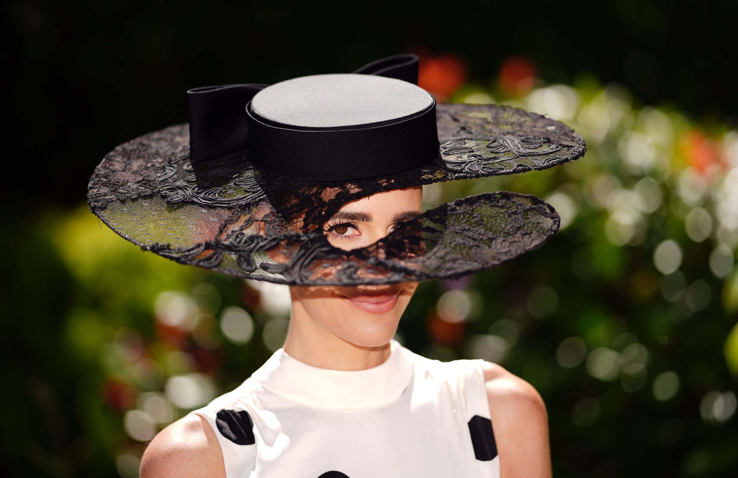 La periodista inglesa Louise Roe, con vestido de Hobbs London y pamela/máscara de Jane Taylor London, una de las favoritas de la aristocracia, que con bajar la vista te permite ver las carreras de caballos.