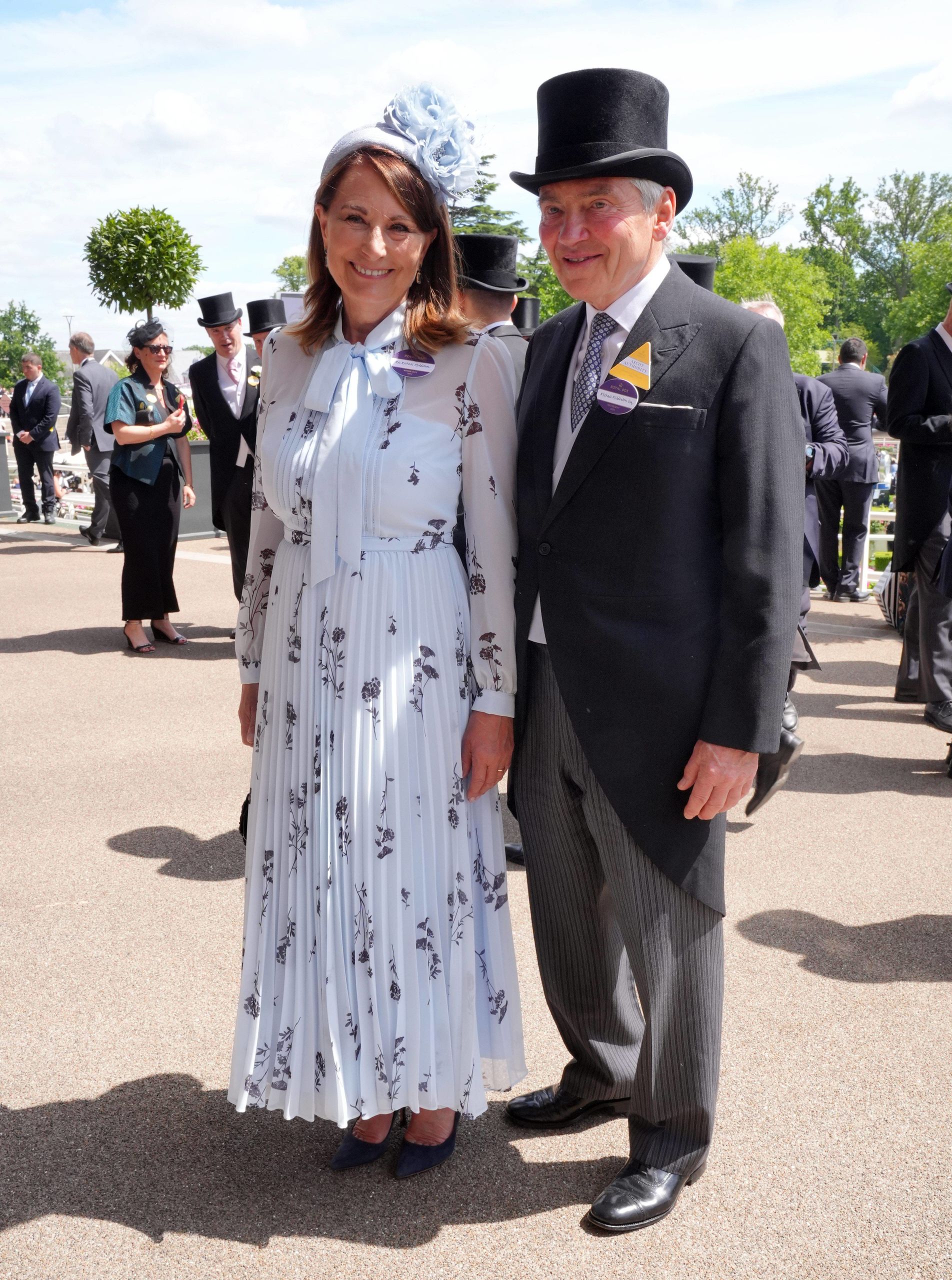 Michael y Carole Middleton, padres de Kate, la gran ausente de la edición de Ascot 2024, también han estado en Royal Ascot. Carole, con vestido azul claro de Self-Portrait, tocado con flores y redecilla en azul pastel y bolso de Kate Spade.