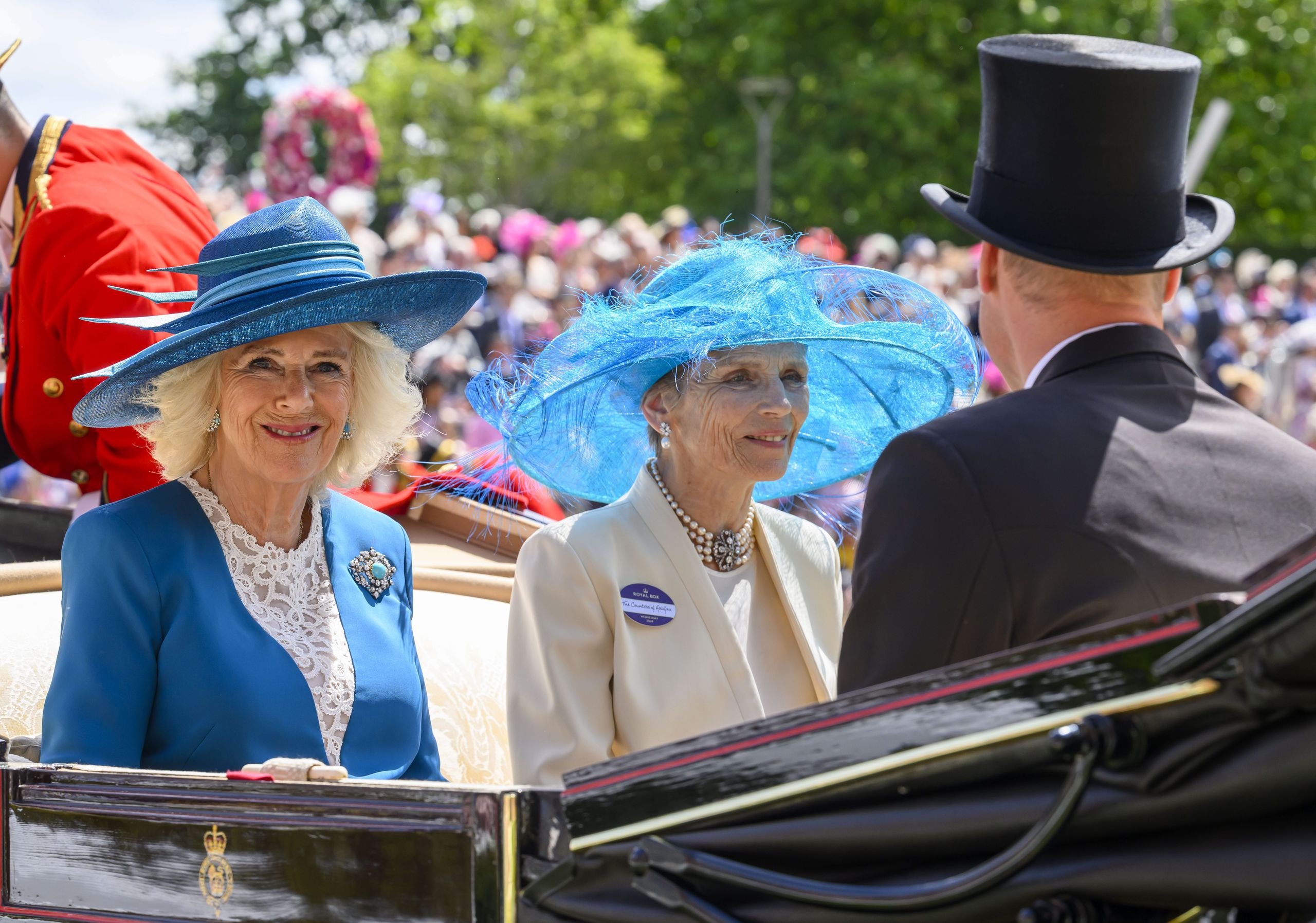 La reina Camilla, en el segundo día de Ascot, lució vestido de Dior, con falda plisada y detalle de encaje blanco en cuerpo y escote, sombrero a juego y el broche con turquesa de la reina Mary.