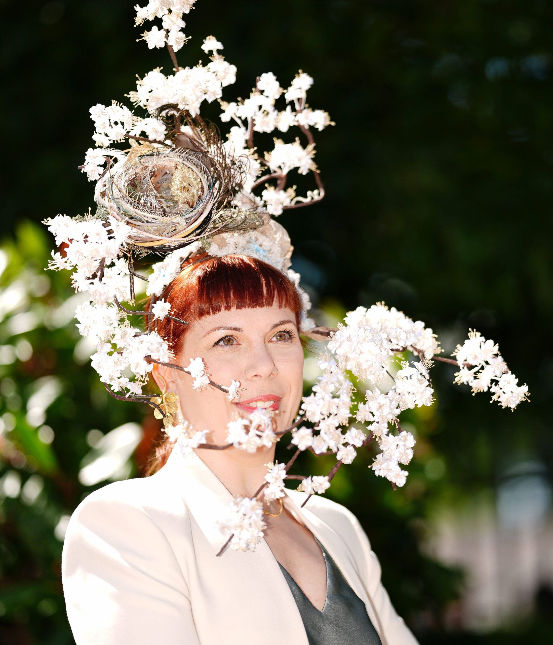 Un tocado que es una oda a la primavera o bien una definición gráfica de un nido de pajaro sobre ramas y flores de almendro.