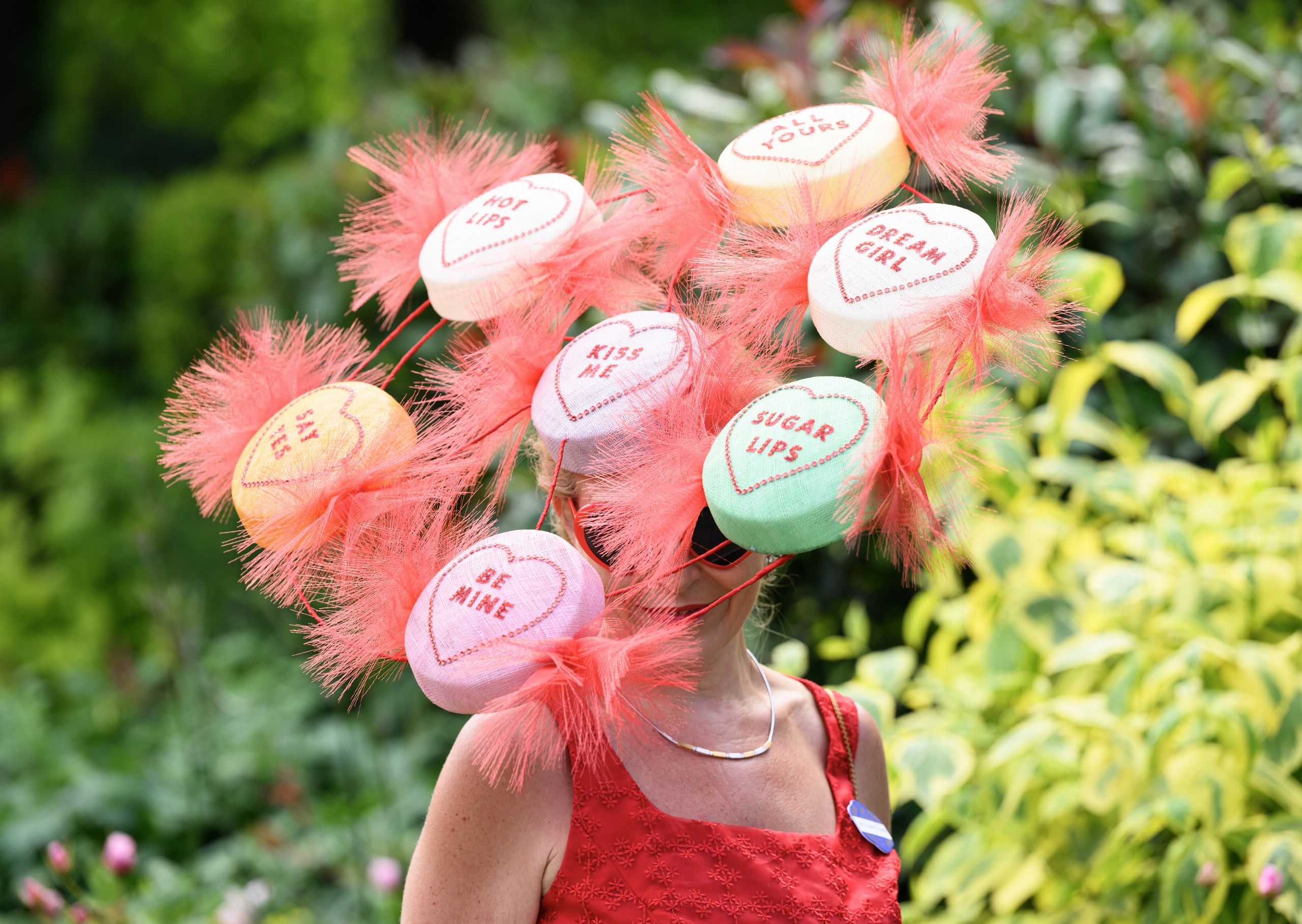 Una de las pamelas más virales de esta edición de Ascot ha sido esta, con círculos que recuerdan a los caramelos en tonos crudos, verdes y rosas que incluyen mensajes de lo más cariñoso.