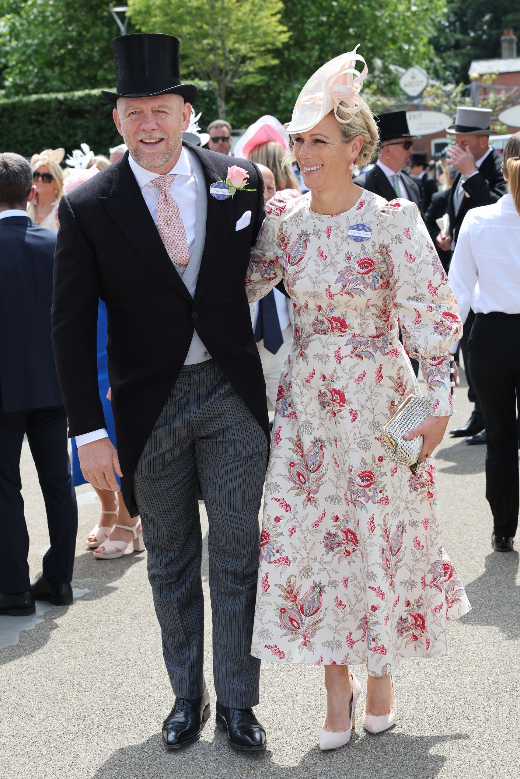 Mike Tindall y Zara Philips, hija de la princesa real Ana, ha llevado un vestido con estampado floral y mangas abullonadas de Anna Mason London, y tocado en color blanco de Juliette Millinery.