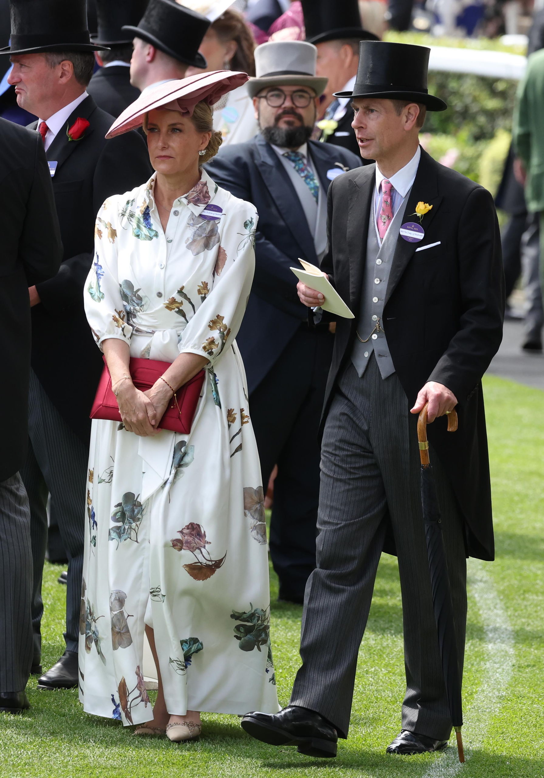 La duquesa de Edimburgo lució un vestido de silueta camisera, con estampado de flores sobre fondo blanco, combinado con un clutch en color burgundy y una pamela rosa de Jane Taylor London, mientras que el principe Eduardo, luió el tradicional chaqué