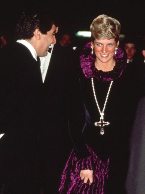 Se trata de la cruz Attallah, un colgante creado en la década de 1920 por los joyeros de la corte Garrard que formaba parte de la colección de Diana de Gales. Se dice que era una de sus piezas favoritas y la lució por primera vez en octubre de 1987 durante una gala benéfica en apoyo de Birthright, una organización que trabaja para la protección de los derechos humanos durante el embarazo y el parto. Aquella noche la combinó con un vestido de su modista Catherine Walker.