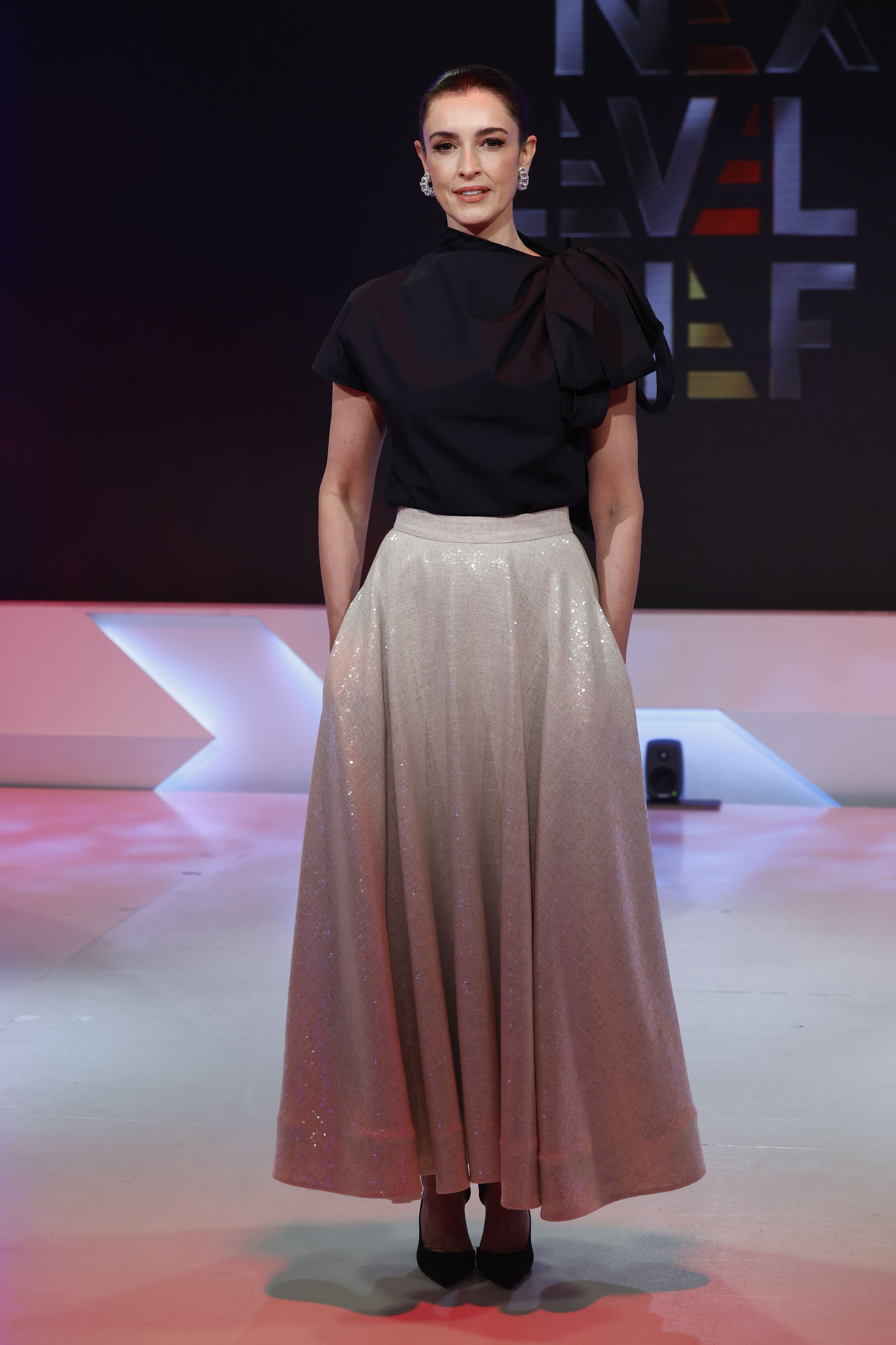 La actriz luce radiante con un vestido cruzado tipo blazer en crepe de seda roja, inspirado en la sastrería londinense y creado por el diseñador español Alejandro de Miguel.
