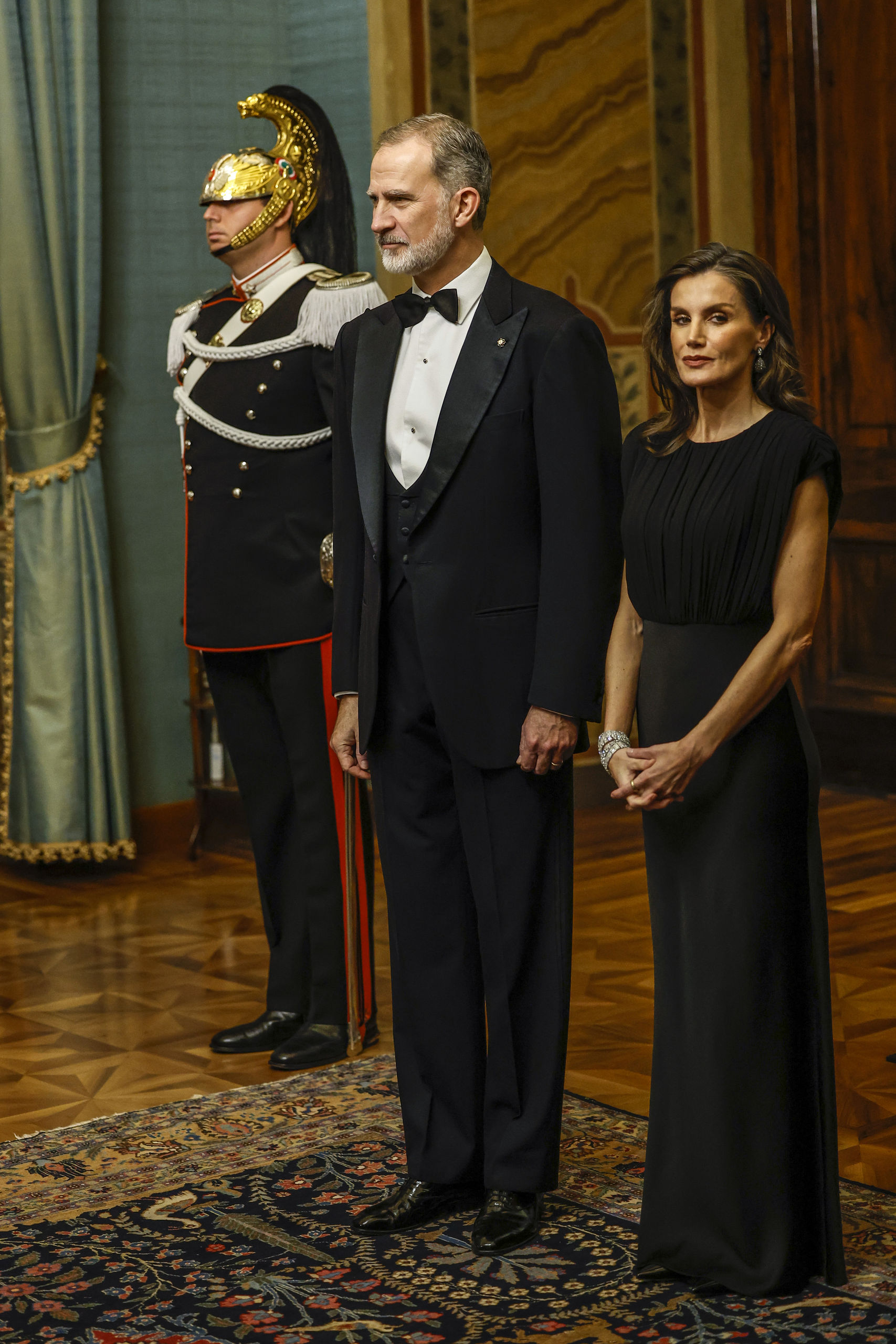 En las grandes ocasiones el armario de la Reina es difícil de copiar no es para todos los bolsillos, como este vestido de Max Mara con cuerpo de seda y falda de raso brillante, pero existen multitud de opciones low cost para lucir igual de elegante.