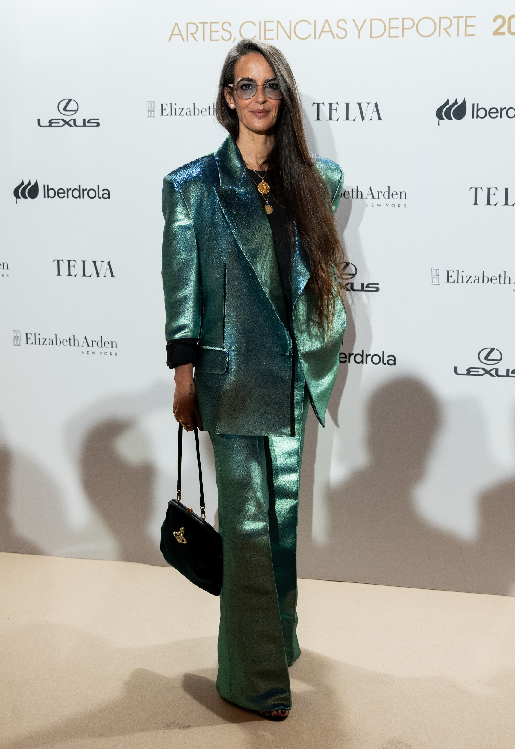 La artista le da un toque modernísimo al traje de chaqueta con un diseño de dos piezas verde metalizado de Pedro del Hierro.