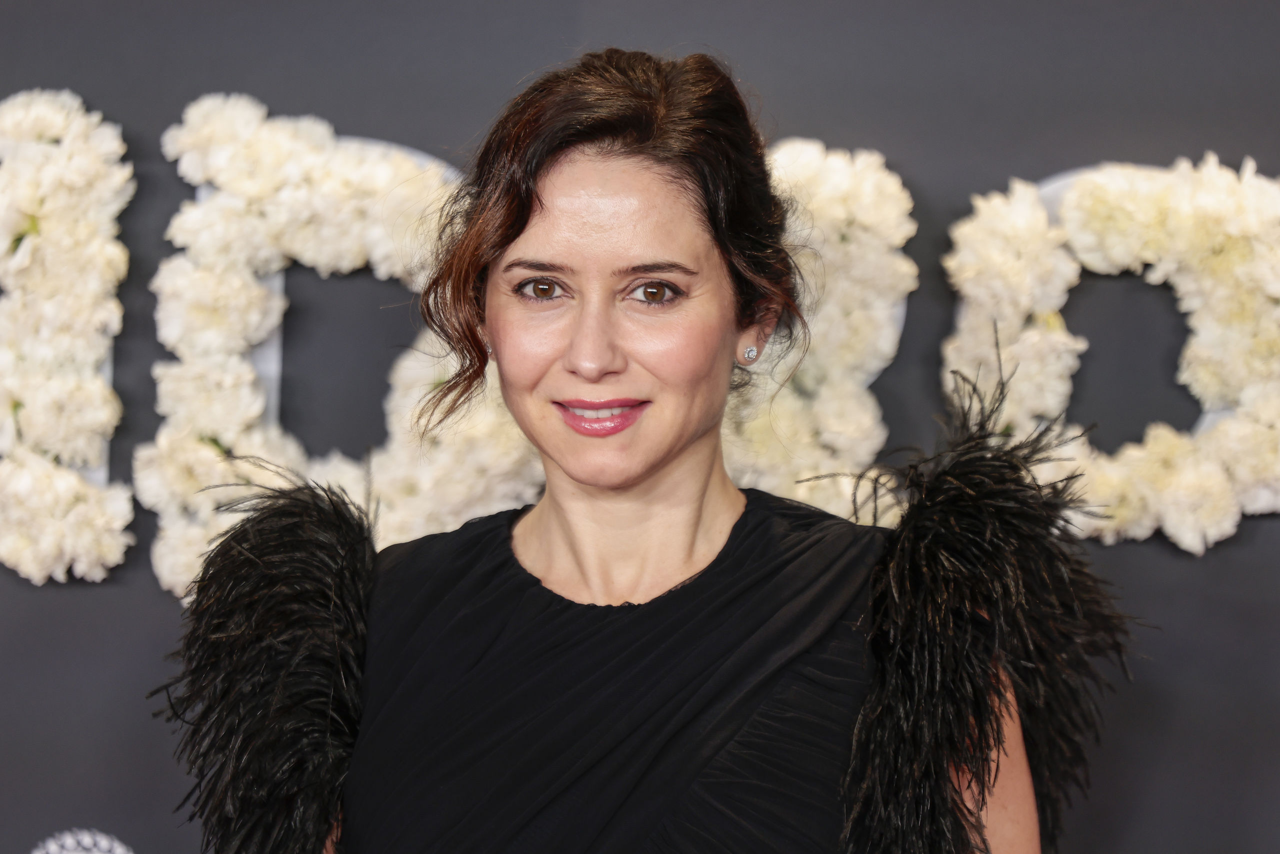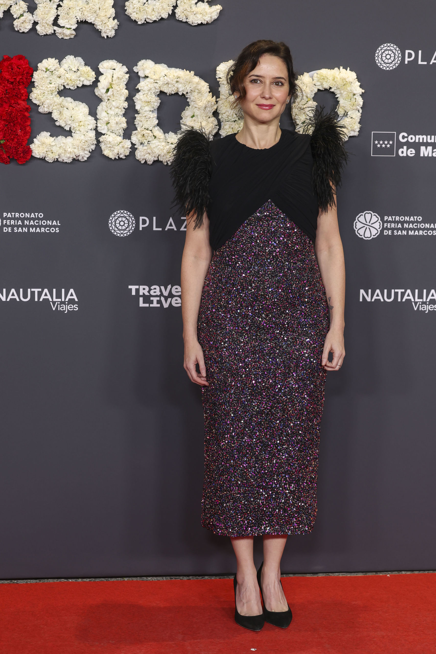 Isabel Díaz Ayuso, presidenta de la Comunidad de Madrid, lució un espectacular vestido de noche efecto dos piezas con cuerpo cruzado y hombreras de plumas y falda midi brillante de lentejuelas rosas y moradas.