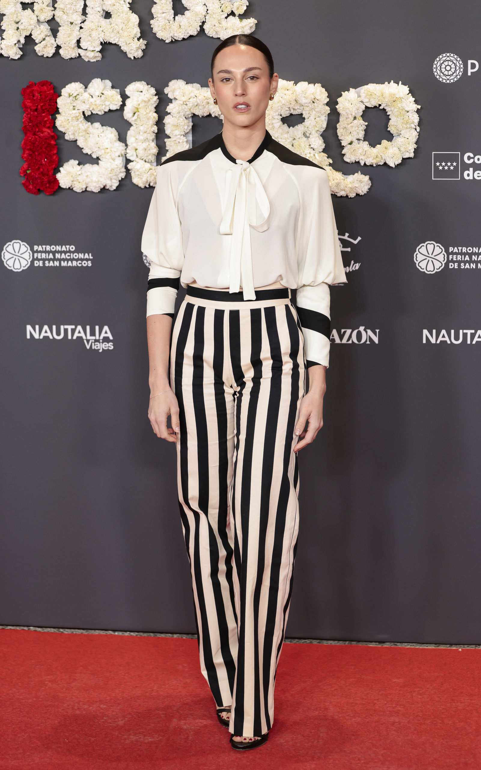 Rocío Laffón, amiga íntima y escudera de Victoria Federica, eligió una blusa blanca con lazo y pantalones a rayas blancas y negras.