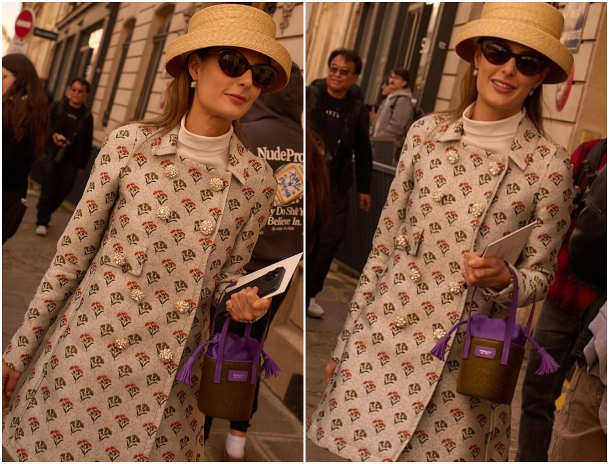 La siempre elegante María de la Orden acudió al desfile de Giambattista Valli con un abrigo a modo de vestido con botonadura joya y bordado floral multicolor, combinado con suéter de cuello alto, sombrero y bolso de mano con detalles en púrpura.