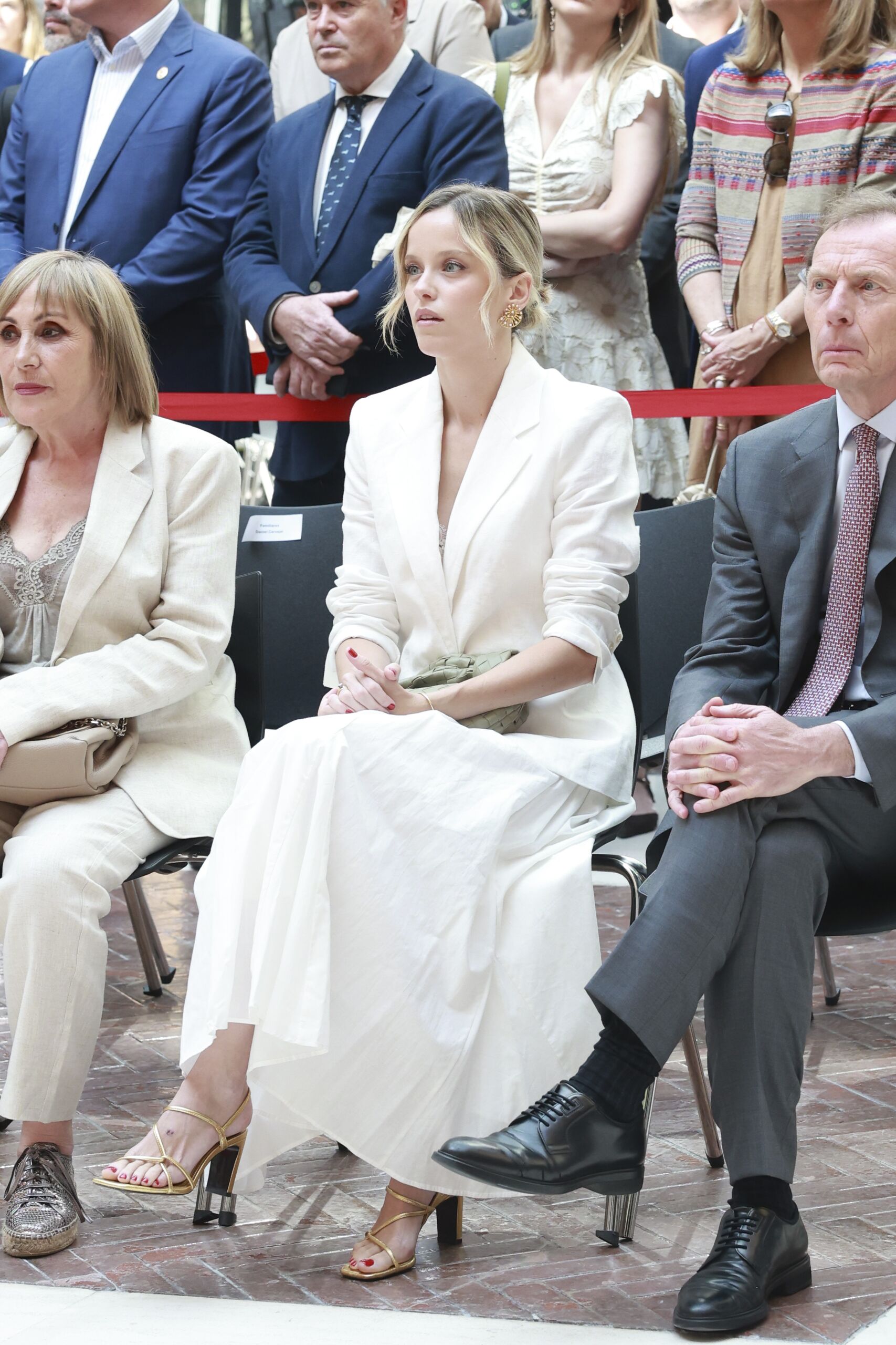 La modelo destacó por su belleza y elegancia vestida con un estilismo blanco al completo formado por americana y falda larga. Como complementos, unos pendientes dorados y sandalias de tacón a juego, además de un clutch verde para darle un toque de color.