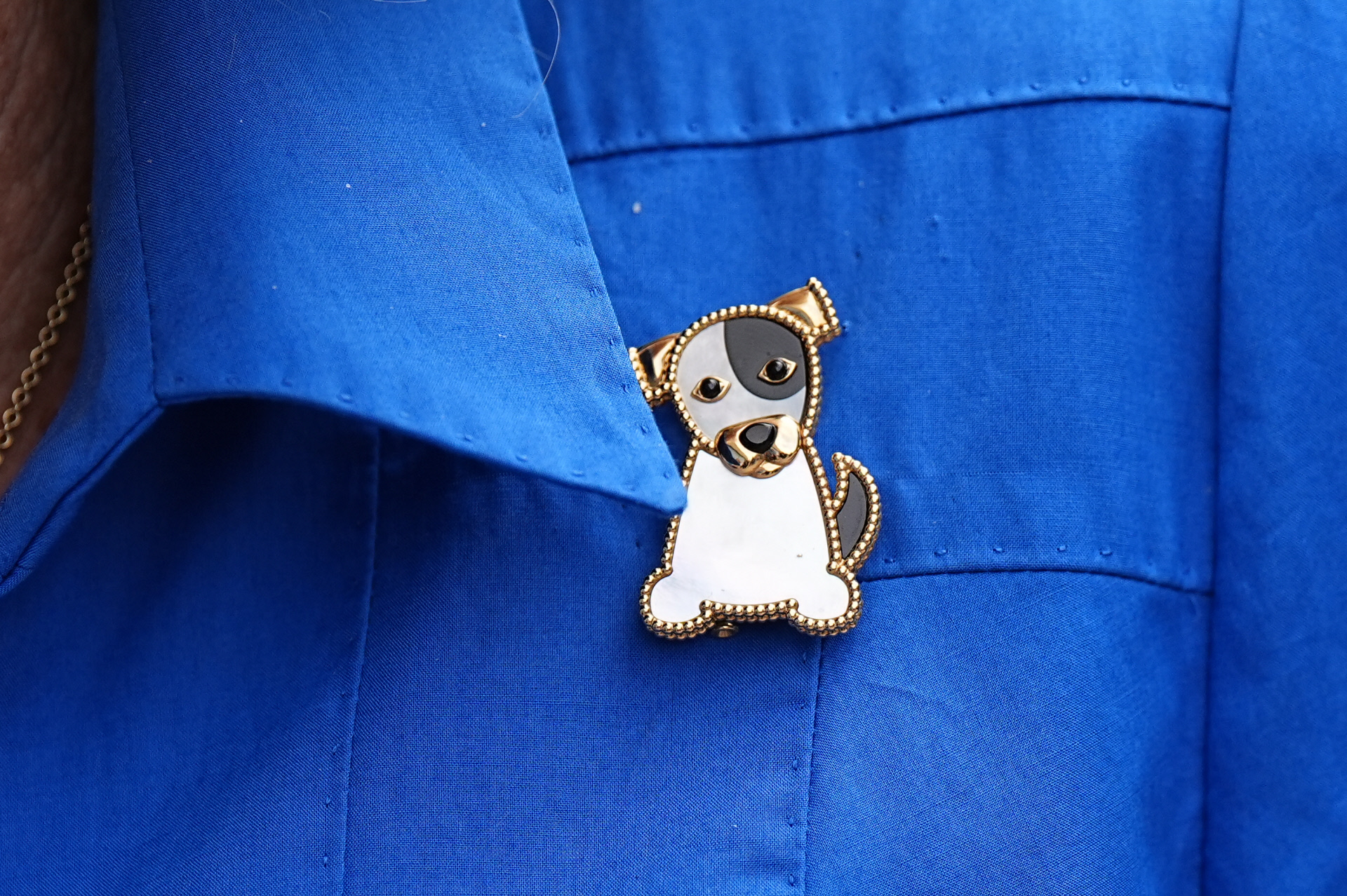 Para la ocasión, la reina lució un broche con forma de perro, confeccionado en oro de 18 quilates, ónix y nácar. La pieza, valorada en más de 7.400 dólares, pertenece a la colección Lucky Animals de 2017 de la exclusiva firma francesa Van Cleef & Arpels.