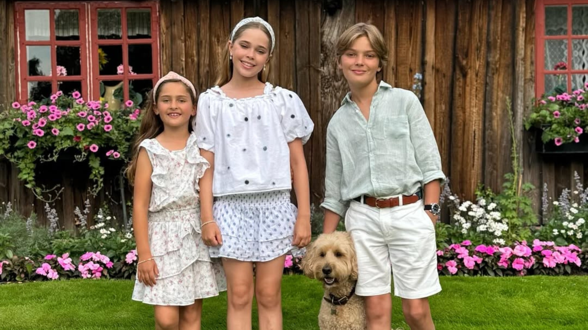 Su hermano Nicolás ha optado por un look casual con unas bermudas blancas, una camisa en tono verde pistacho y unos mocasines de color azul, a juego con su reloj. La pequeña de los tres, su hermana Adrienne, ha lucido un conjunto de blusa sin mangas y falda de volantes de color blanco con estampado en rosa pastel, combinándolo con sandalias blancas y al igual que su hermana mayor, una diadema del mismo estilo para despejar el pelo de la cara.