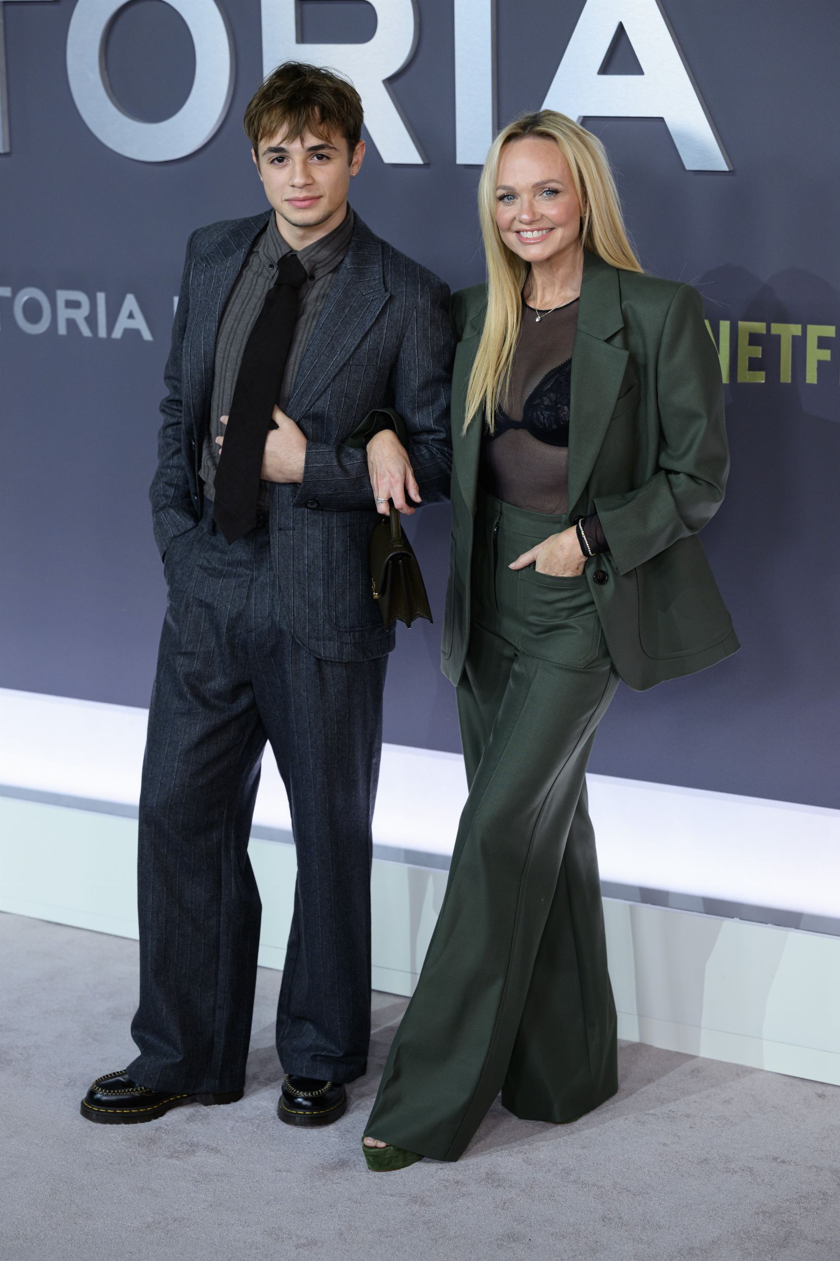 Emma Bunton, otra de las chicas favoritas de la Spice Girl y su Beau Bunton, posaron para el photocall. Diferentes a los looks que hemos visto hasta ahora en la alfombra, ella optó por un traje verde botella, color que viene pisando fuerte esta temporada, en la parte de abajó lució un top siguiendo la tendencia de las transparencias. Su hijo también lució un traje de color gris jaspeado con camisa negra. Colores diferentes pero siguiendo la estética del evento.