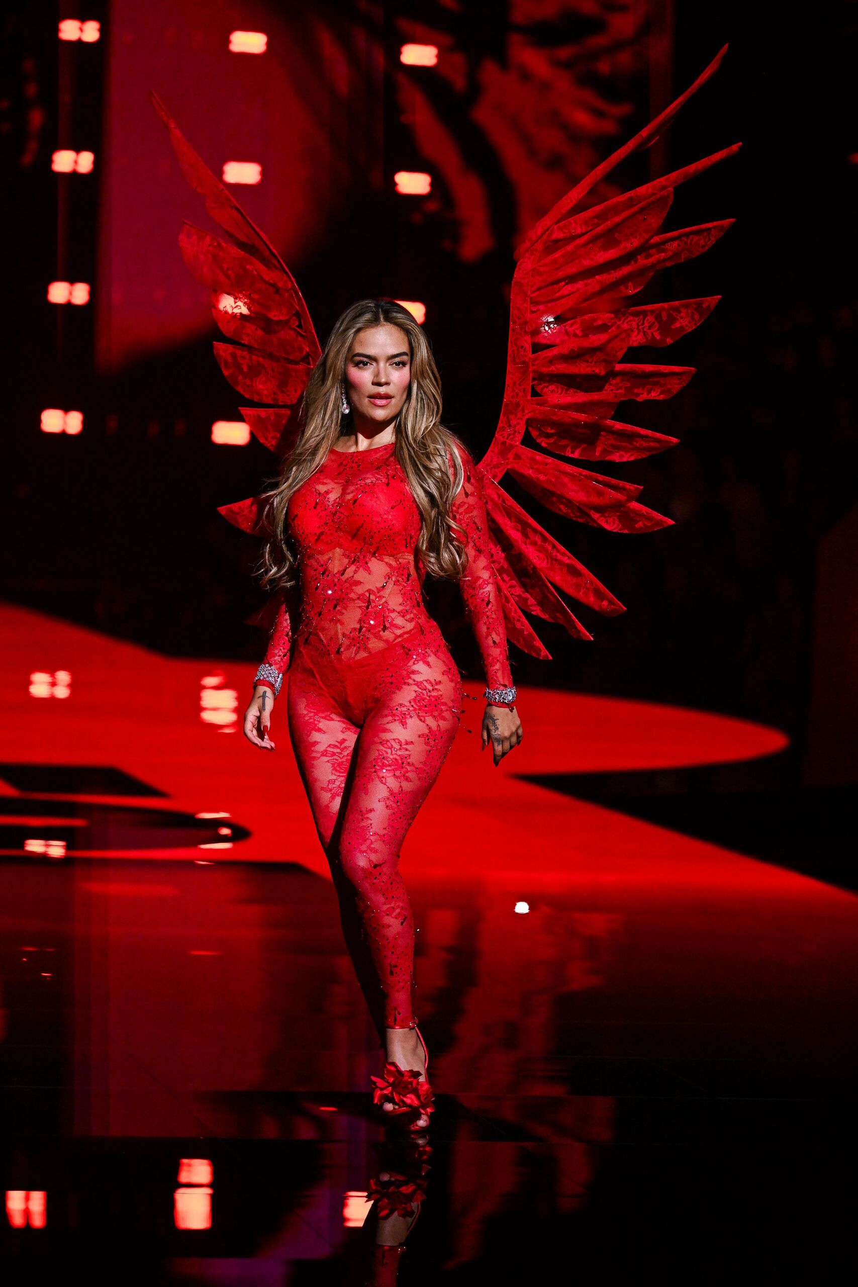 Karol G, junto a otras artistas, se encargó de poner el ritmo y la música al desfile. No solo cantó, sino que también desfiló en la pasarela con un atrevido conjunto rojo y las míticas alas a juego.