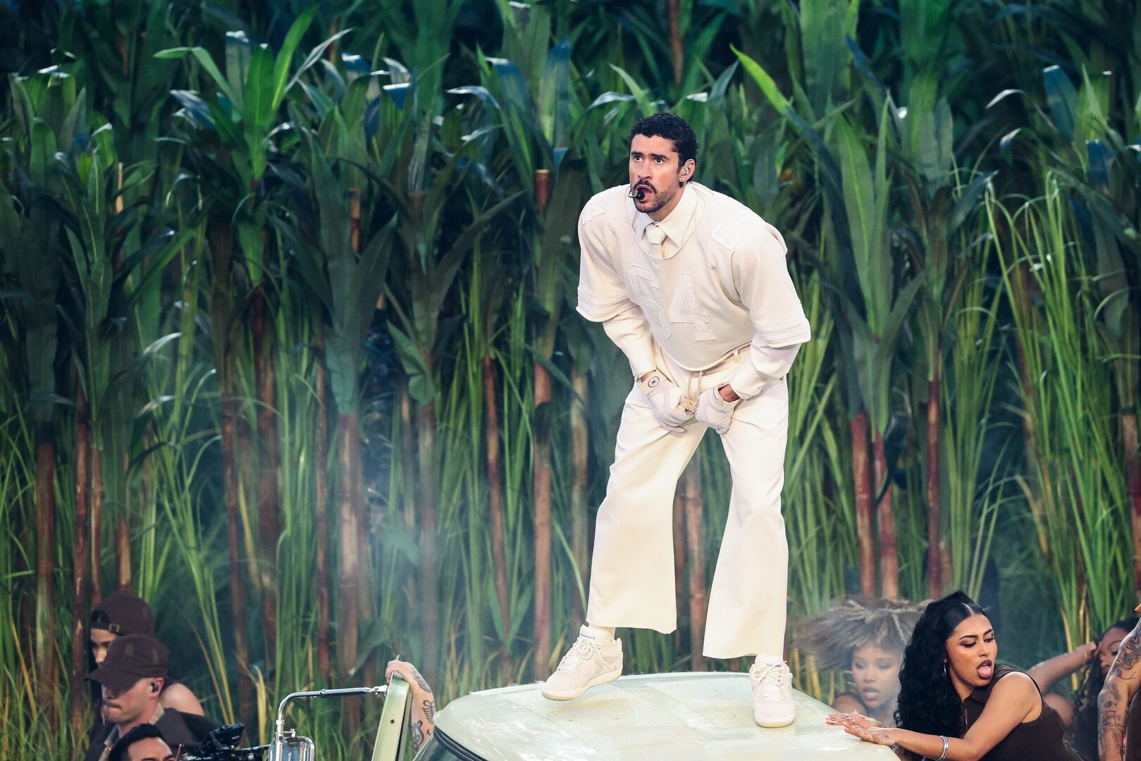 En la segunda parte del espectáculo, añadió una blazer cruzada del mismo tono, manteniendo la estética cromática del conjunto. Para rematar el look, lució un reloj Royal Oak de Audemars Piguet en oro amarillo con esfera de malaquita y sus propias zapatillas "BadBo 1.0" junto a Adidas, que saldrán a la venta en las próximas semanas