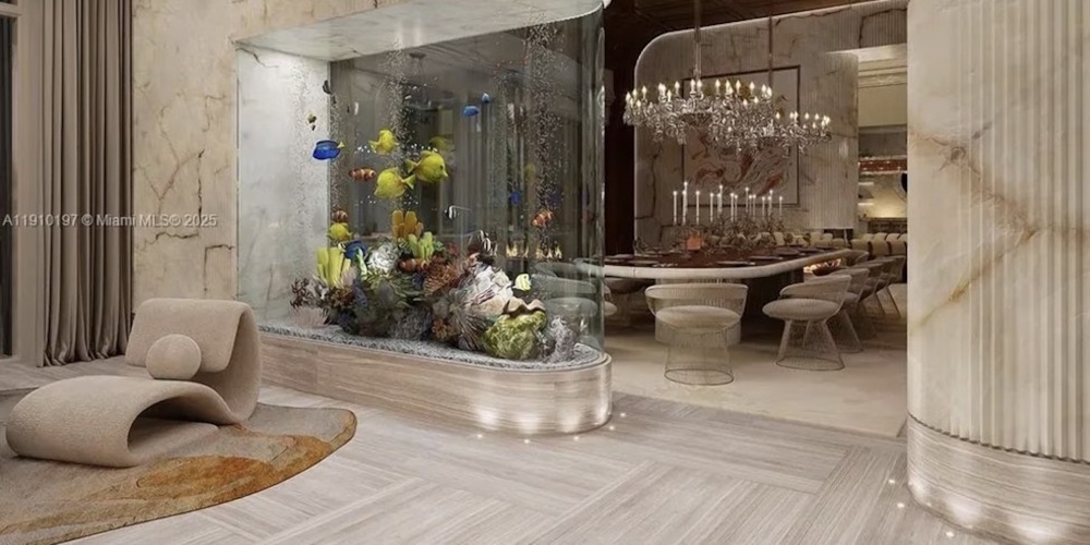 Entre los elementos más llamativos se incluyen un acuario, una biblioteca con un pasadizo secreto y amplios espacios interiores conectados con jardines y zonas de piscina, siguiendo el estilo de vida abierto característico de Miami.