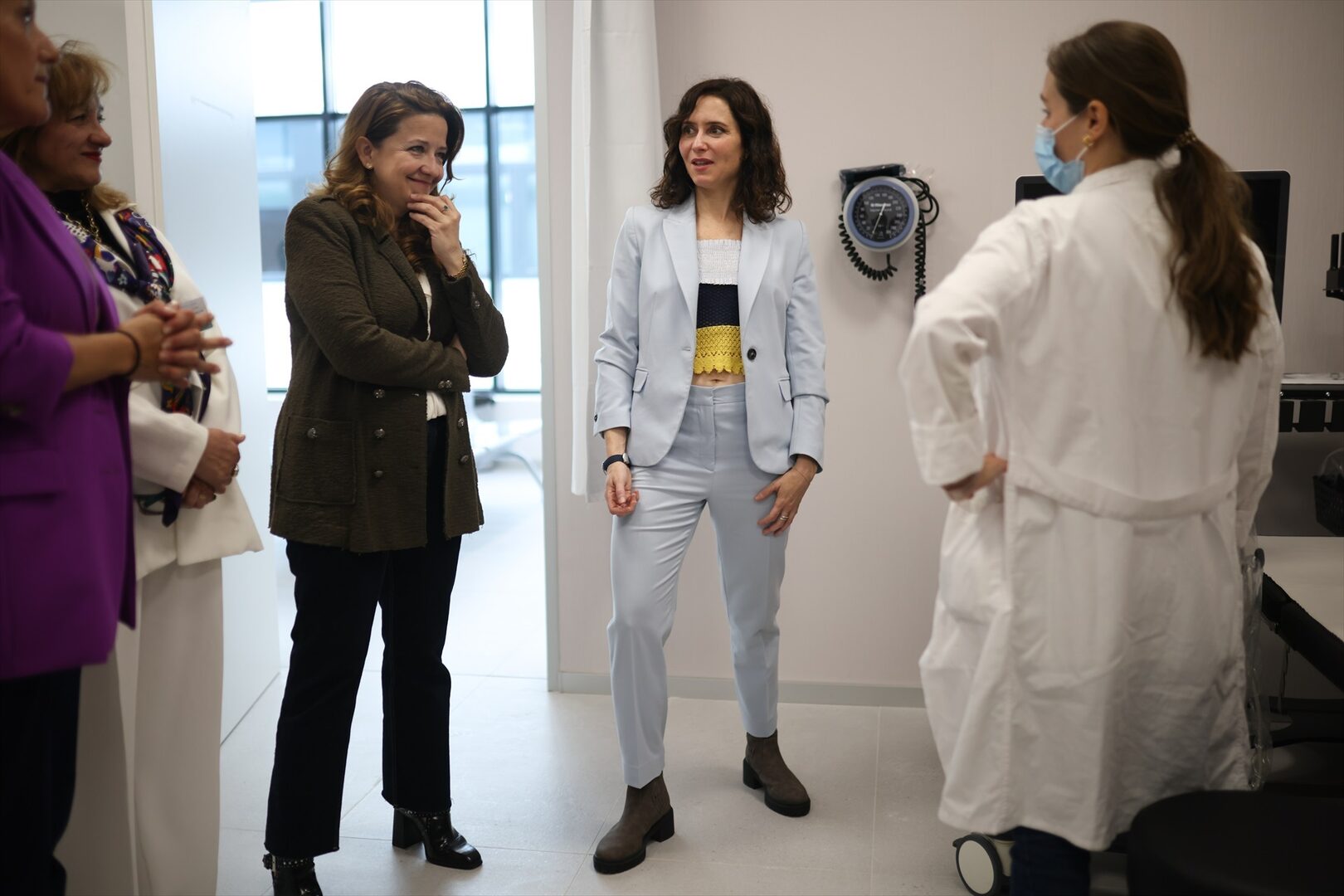Hasta ahí, el look no se alejaba demasiado de su estilo habitual. Sin embargo, bajo la americana, Ayuso optó por un top de crochet y nido de abeja en color block —blanco, azul marino y amarillo—, con tirantes ajustables y un corte que dejaba ver ligeramente el ombligo.