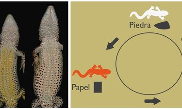 Los tres morfotipos de lagartijas de turbera de los ciclos de preeminencia de unos machos frente otros. MNCNcomunica/ Luis M. San José Según científicos españoles Las lagartijas de turbera juegan a 'piedra papel o tijera' en su estrategia evolutiva Las hembras buscan maximizar la supervivencia de las crías el primer año.