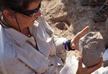 La investigadora Sonia Harmand examinando una herramienta de piedra | MPK-WTAP