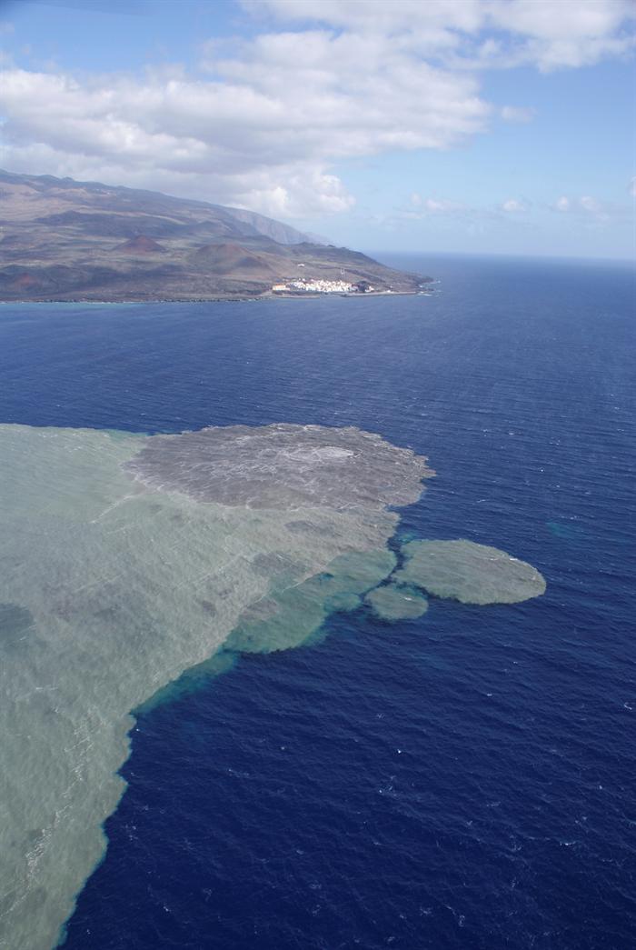 Mayor aportación de sólidos en la superficie impulsados por los gases emanados del centro emisor de la erupción volcánica submarina localizada al sur de la isla