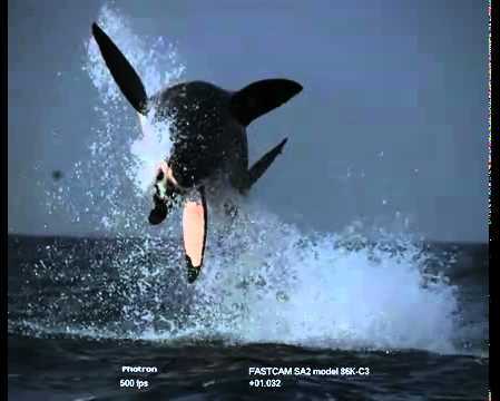 Imágenes a cámara lenta del salto de un tiburón mientras caza una de sus presas.