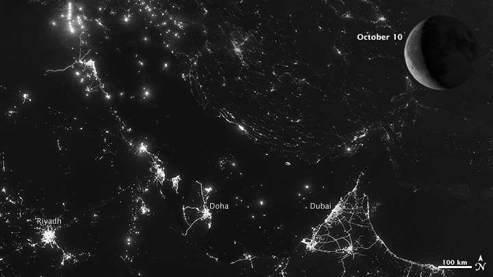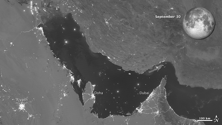 Esta serie de cuatro fotos refleja la luz en el Golfo Pérsico según la fase de la luna. La primera fue tomada con luna llena el pasado 30 de septiembre.