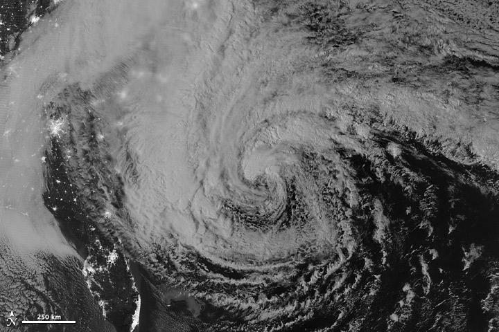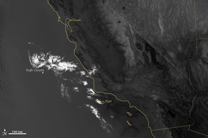 El satélite es capaz de fotografiar las nubes bajas en el Pacífico junto a la costa estadounidense y la sombra que sobre ella proyectan las nubes altas próximas a tierra.