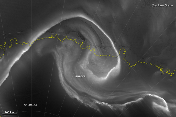 La luz de la aurora boreal es tan potente que permite apreciar los bordes la costa de la Antártida.