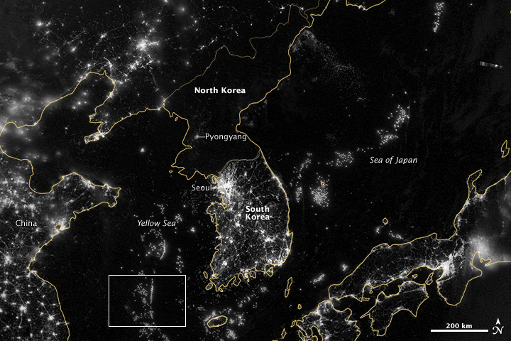 El recuadro destacado muestra barcos en el mar Amarillo y cómo algunos de estos están dispuestos en línea recta, como una frontera marítima.