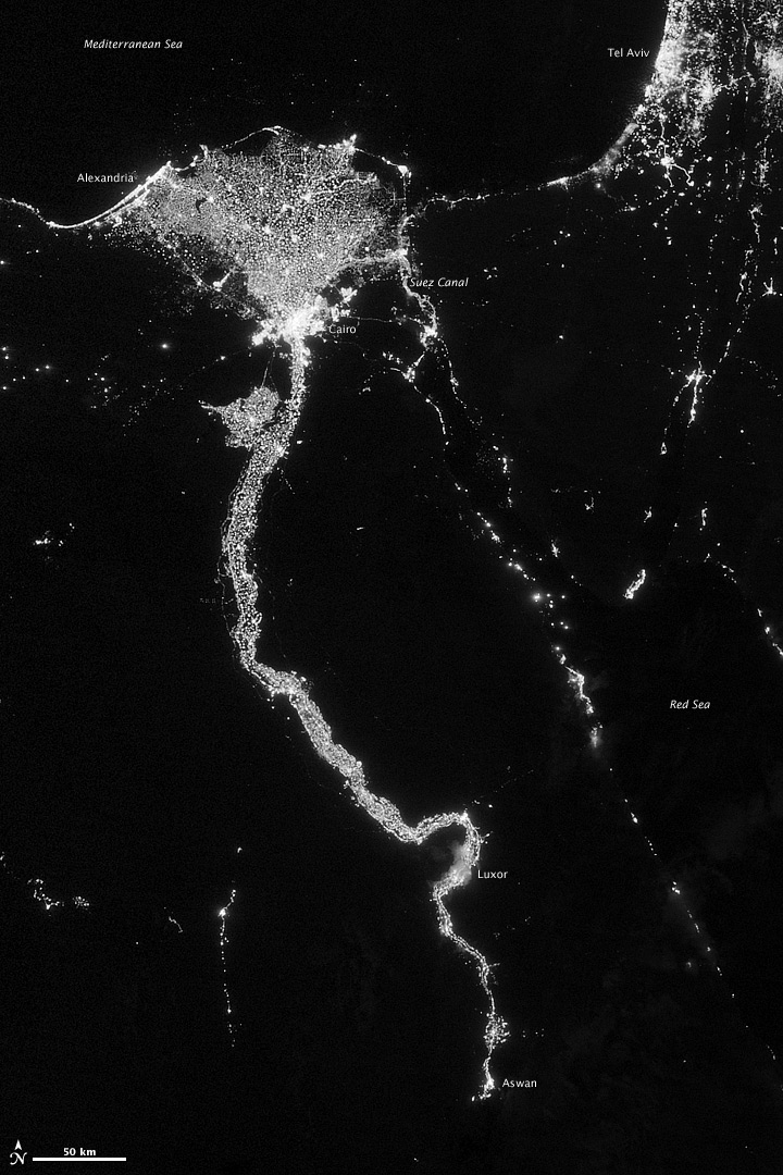 El 97% de la población de Egipto habita las orillas del Nilo, como se aprecia en esta foto nocturna del delta.