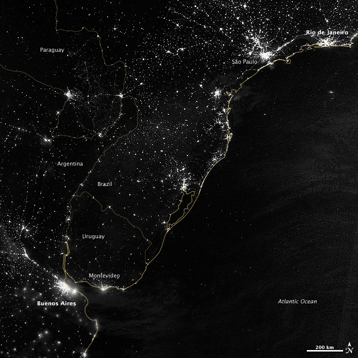 Foto nocturna de la costa atlántica de Sudamérica, tomada el pasado 20 de julio