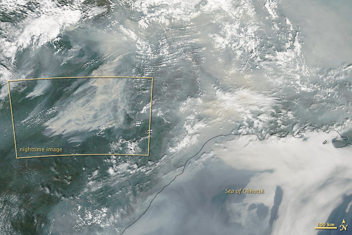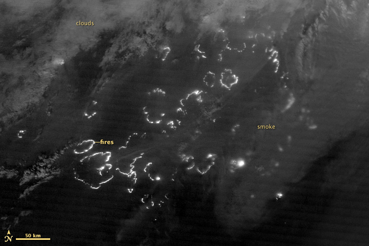 El satélite consigue captar con precisión imágenes nocturnas de incendios forestales. En la foto, las luces blancas corresponden a distintos fuegos en Siberia. El humo es de un color algo más oscuro que las nubes también visibles en la imagen