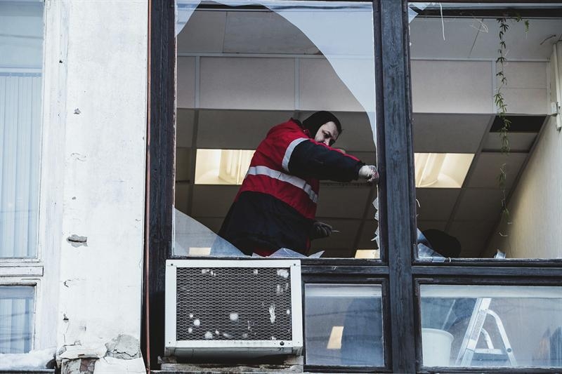 Un trabajador retira restos de cristal de uno de los edificios afectados