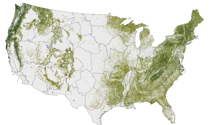 Mapa de la masa forestal en EEUU, realizado por científicos de la NASA