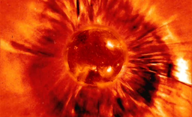 Las imágenes de SOHO se muestran con una diferencia de 3 radios solares desde el borde del disco solar y un ocultador bloquea la intensa luz del Sol para revelar los detalles más tenues de la corona.