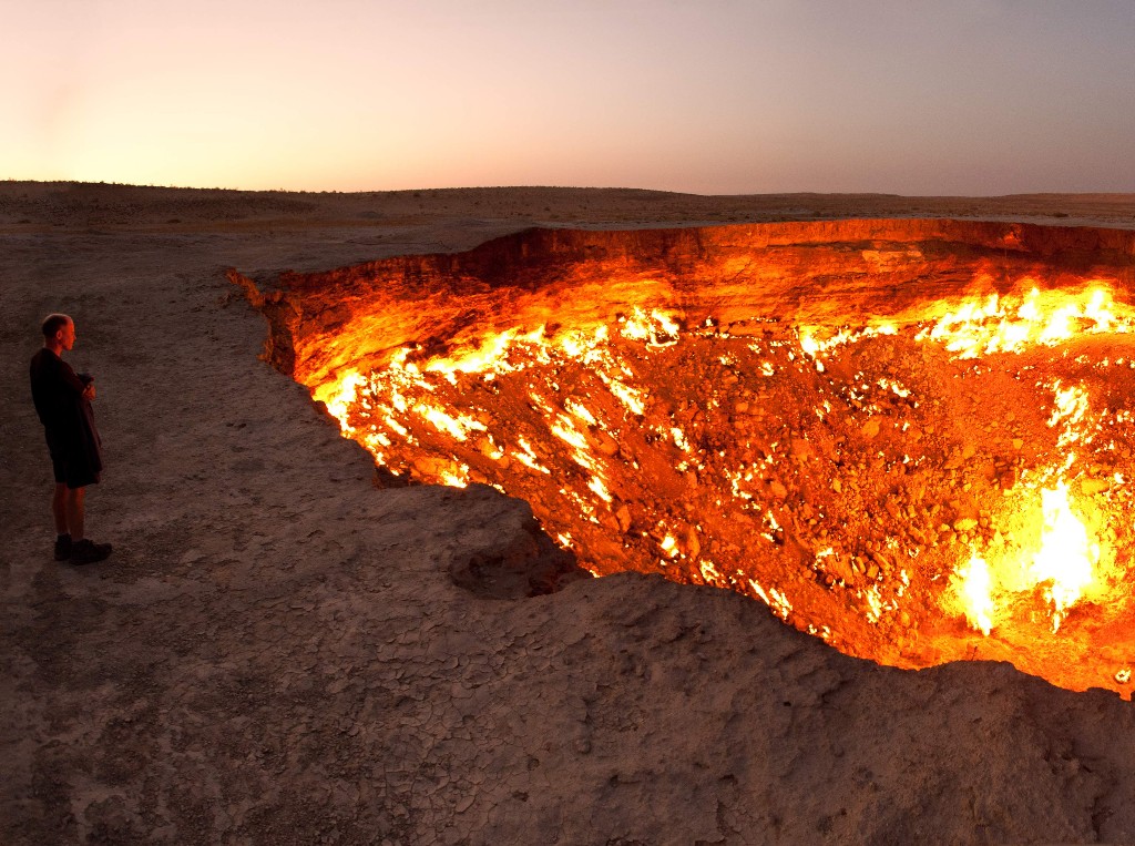En el inhóspito desierto de Karakum, que ocupa la mayor parte de Turkmenistán, se encuentra la llamada "Puerta del Infierno": un cráter de unos 70 metros de diámetro con llamas perpetuas. Su origen se remonta a 1971, según el diario británico Daily Mail, cuando un grupo de geólogos soviéticos vio cómo el techo de una caverna subterránea llena de gas natural se hundía mientras hacían una prospección. Para evitar posibles emisiones de gases tóxicos, decidieron prenderle fuego. Más de 40 años después, el fuego del conocido como cráter de Darvaza no se ha apagado.