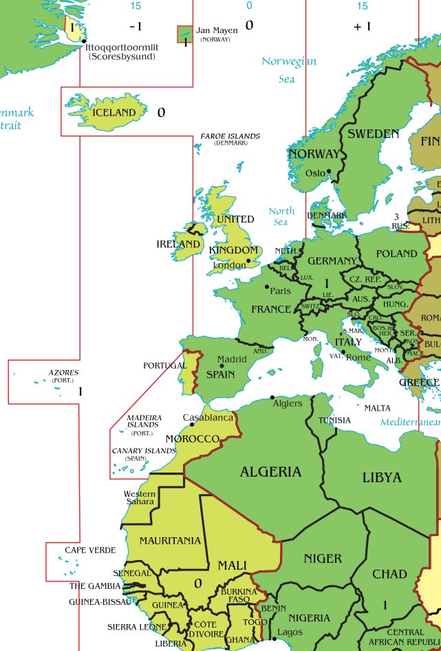 El meridiano que sí atraviesa Canarias es el que marca una longitud de 15 grados hacia el oeste, que es el que se emplea como centro del huso horario GMT-1. No obstante, los países africanos cercanos a las Islas Afortunadas o Islandia emplean el huso GMT pese a que, como España, por geografía deberían emplear otro. Sólo en Groenlandia, Cabo Verde y las Islas Azores está actualmente vigente ese huso horario.