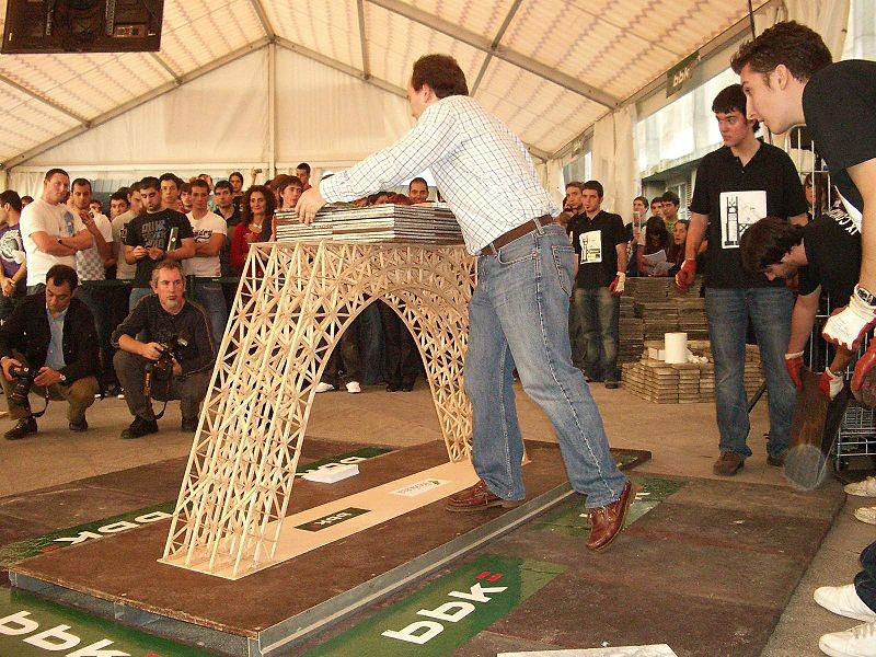 El puente de Pablo Cearra, un exalumno de la Escuela Superior de Ingeniería de Bilbao que ha ganado el concurso en siete ocasiones, estaba formado por 4.000 palitos de helados, con un peso de 3,7 kilos, y una luz (la distancia entre los pilares del puente) de 1,10 metros.
