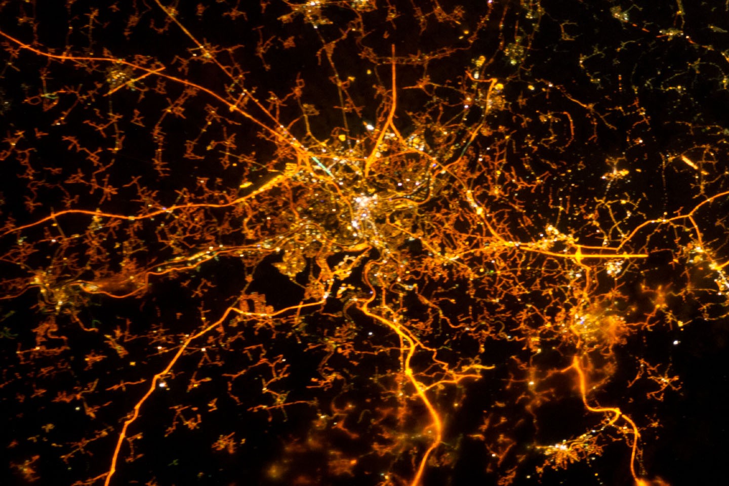 La estructura radial de las comunicaciones en la ciudad belga de Lieja quedó al descubierto en esta imagen nocturna