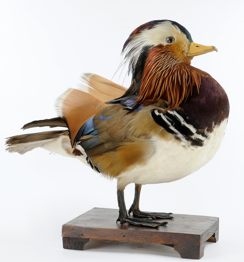 En la exposición abundan los animales disecados, como este pato mandarín.