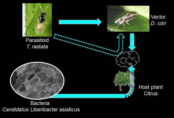 En el caso del estudio la planta es un árbol cítrico del género Citrus, que libera salicilato de metilo cuando es atacado por el pulgón saltador Diaphorina citri. Este insecto, conocido como ‘psílido asiático de los cítricos’, se alimenta cuando es joven la savia de la planta y se ve atraído por el ‘llanto’ químico que emite el árbol.