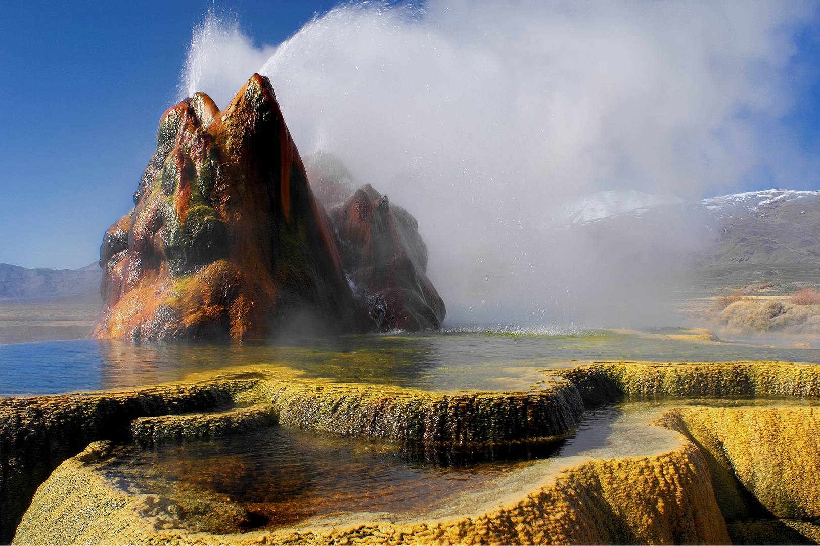 Es un voluminoso montículo multicolor en formación de terrazas del que emanan varios chorros vaporosos situado en el rancho Fly, una propiedad privada del desierto Black Rock en Nevada (Estados Unidos).