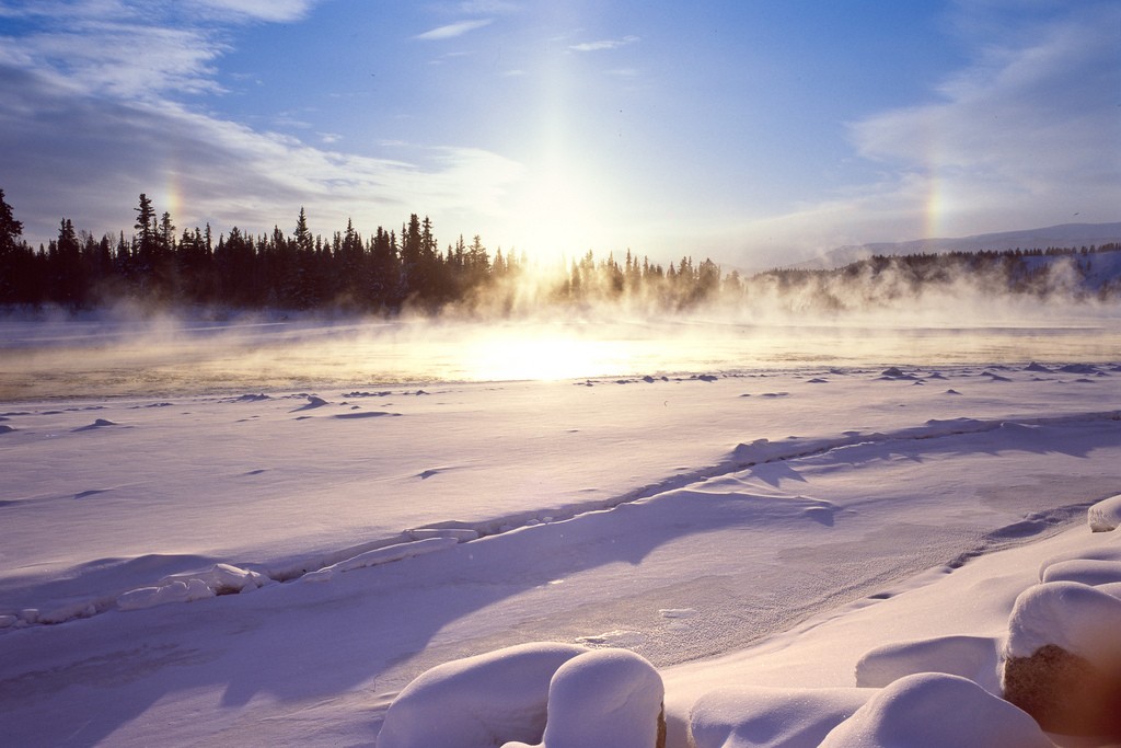 El territorio de Yukón es el más occidental en Canadá. Limita con Alaska y registró, en 1947, la temperatura más baja de América del Norte, con -63ºC. En sus cortos veranos pueden alcanzar los 20ºC pero en lo más duro del invierno la media no supera los -30ºC.