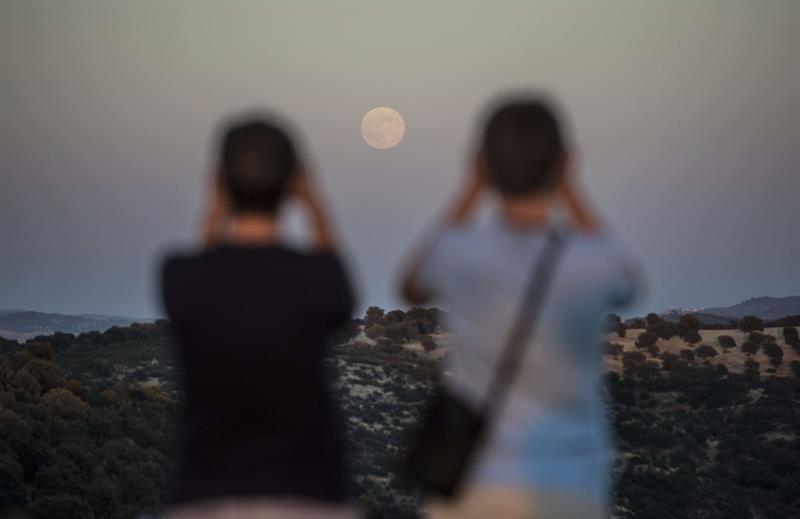 Dos aficionados a la astronomía disfrutan de la Superluna en los Llanos de Espiel, el único punto de Córdoba que cuenta con certificación de Reserva Starlight de Sierra Morena. EFE/Rafa Alcaide