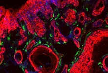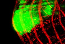 En verde, detalle de un tumor rodeado de fibras musculares del intestino de Drosophila, en rojo. / O Martorell (IRB Barcelona)