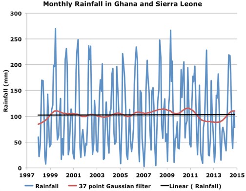 Además, las consecuencias de un cambio en las temperaturas sobre el ciclo del agua no está tan clara. Por ejemplo, y tal y como recuerdan en el blog especializado WattsUpWithThat, el cambio climático no ha jugado hasta ahora ningún papel en el agua caída por lluvia en la región, como atestigua esta gráfica: